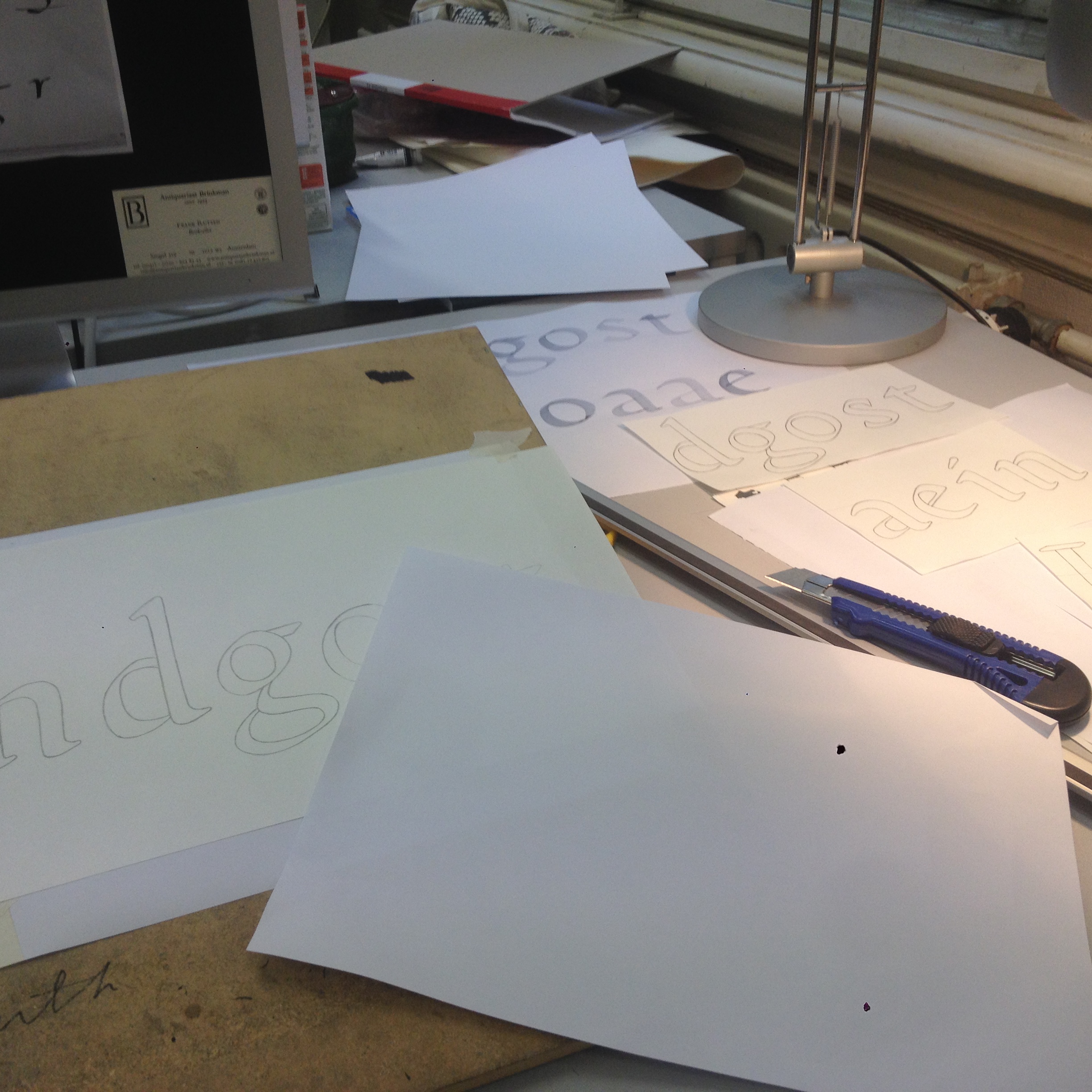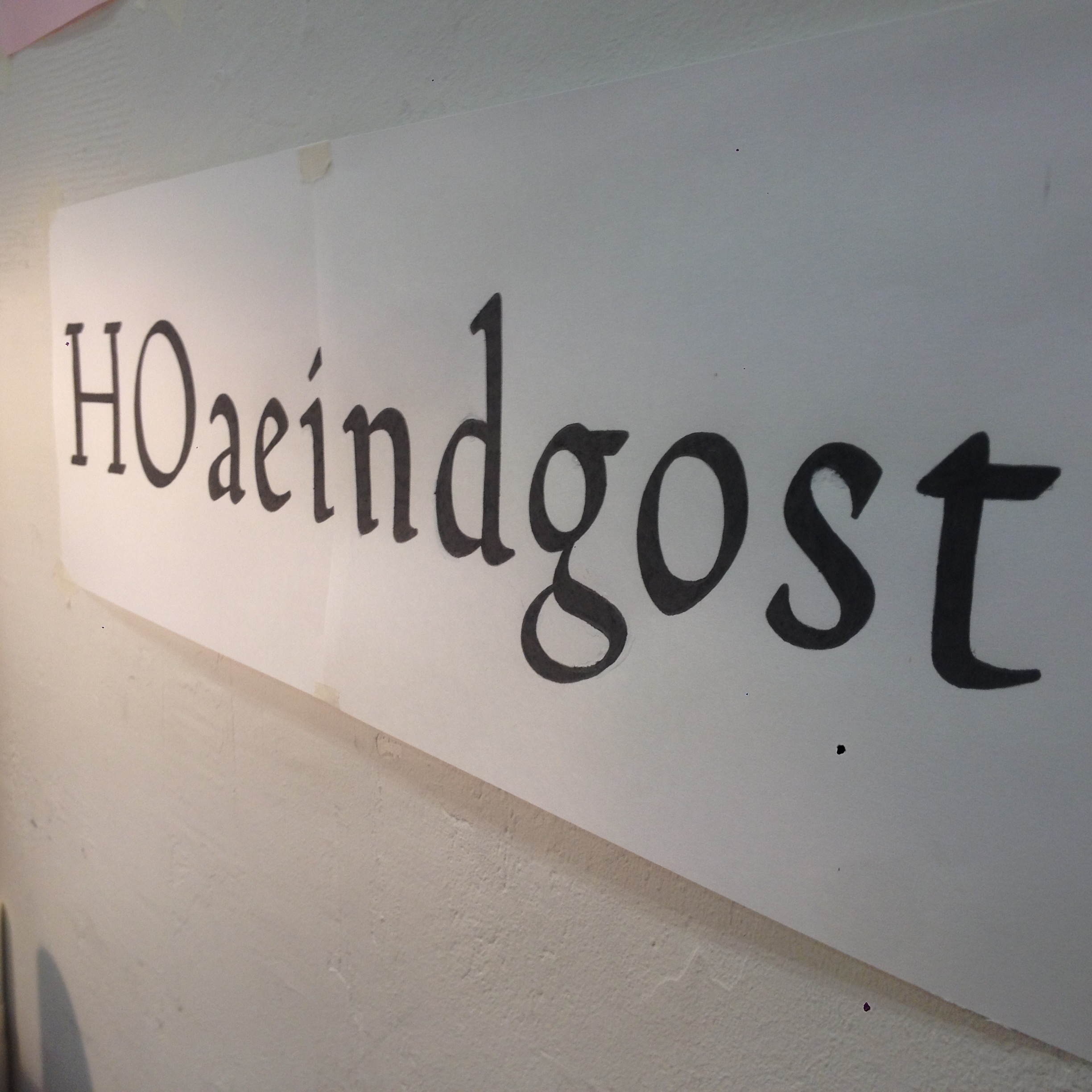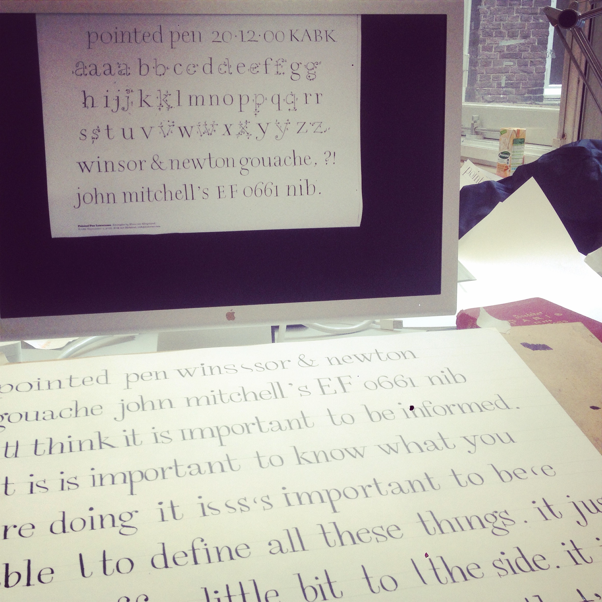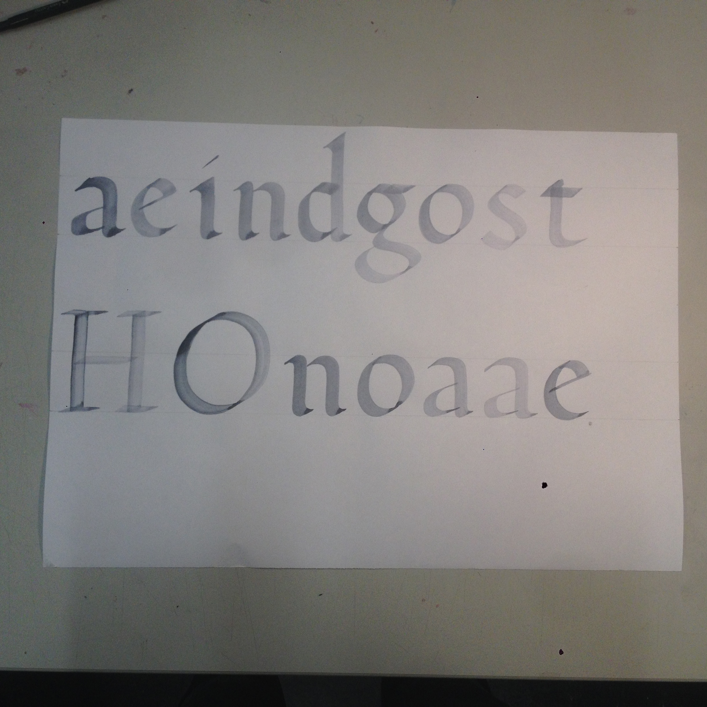 Days go, and you begin to realise that it’s all about the process. So many things start to happen that you have no time for anything. You spend more and more time at school. Come early in the morning and leave late in the evening. IMG_7539 You have lessons. IMG_7490 IMG_6980 Then you go to the shop, buy all the stuff for writing and start to practice. IMG_6959 First of all, writing with a brush. You write at school. You write at home. Everywhere 🙂 IMG_7289 IMG_6956 IMG_6963 IMG_6945 IMG_6946 You also write with a pointed nib. First week just all types of lines. Then you can start to write words. IMG_7010 IMG_7012 IMG_7016 Another important thing, apart from practise, is watching. You should look around as much as you can. Look for interesting books and letters. The more you see, the better. First of all, you have lectures where you see lots of everything. Supernice, but if we are told about something, we can see it live. It’s a totally different impression, when you look at the book in reality, not on the screen. Thanks to Jan Willem Stas for that. IMG_7390 IMG_7051 IMG_7054 IMG_7029 IMG_7025 IMG_7045 IMG_7046 IMG_7047 IMG_7067 IMG_7096 IMG_7098 IMG_7071 IMG_7070 IMG_7075 IMG_7084 IMG_7411 IMG_7091 IMG_7092 IMG_7106 IMG_7125 We have excursions too. Amsterdam Special Collections last week, Gemeentemuseum next week. IMG_7253 IMG_7186 IMG_7189 IMG_7194 IMG_7198 IMG_7210 IMG_7212 IMG_7213 IMG_7458 IMG_7232 IMG_7238 IMG_7259 IMG_7269 School library. They have an amazing second floor there. And many-many books about everything. IMG_7378 IMG_7353 IMG_7359 IMG_7360 IMG_7363 When you look at things you always see something interesting for your work there. For example, I found a book on the flee market. A Baedeker guide around Paris, 1907. It has really amazing engraved maps. So I tried some of the letter shapes from there for my writing with a pointed nib. IMG_7428 IMG_7423 IMG_7424 IMG_7339IMG_7391 IMG_7392 Now we gradually move from writing to drawing. But writing is a basis. Our first assignment looks like this. We take a brush, and write HO aeon (b, d, p, q) gost. Then, we use this writing as a skeleton for our drawing of these letters. Normal contrast. So you write first, then draw the pencil outlines on marker paper (it is transparent), then revise spacing and draw again with a black marker.