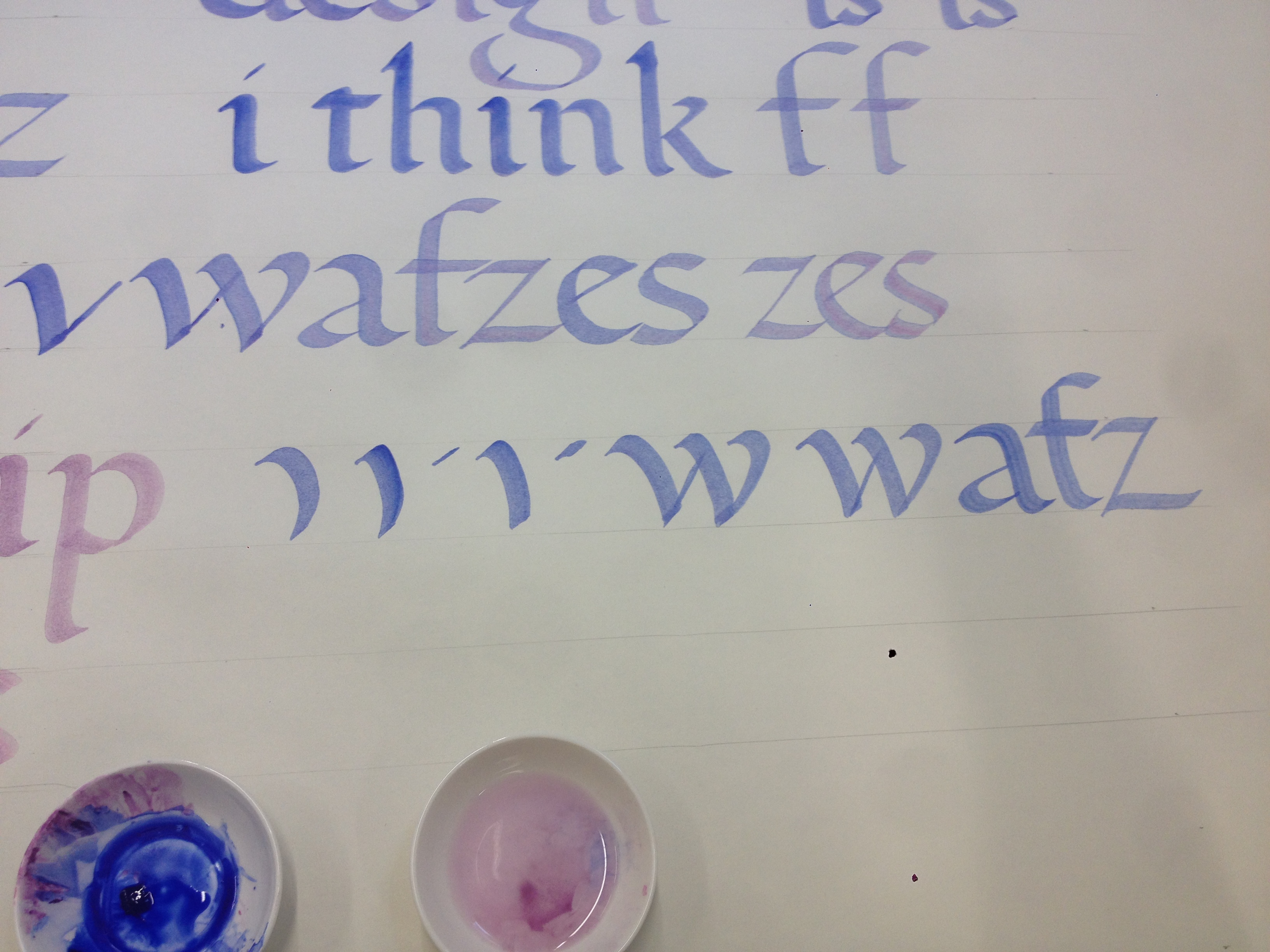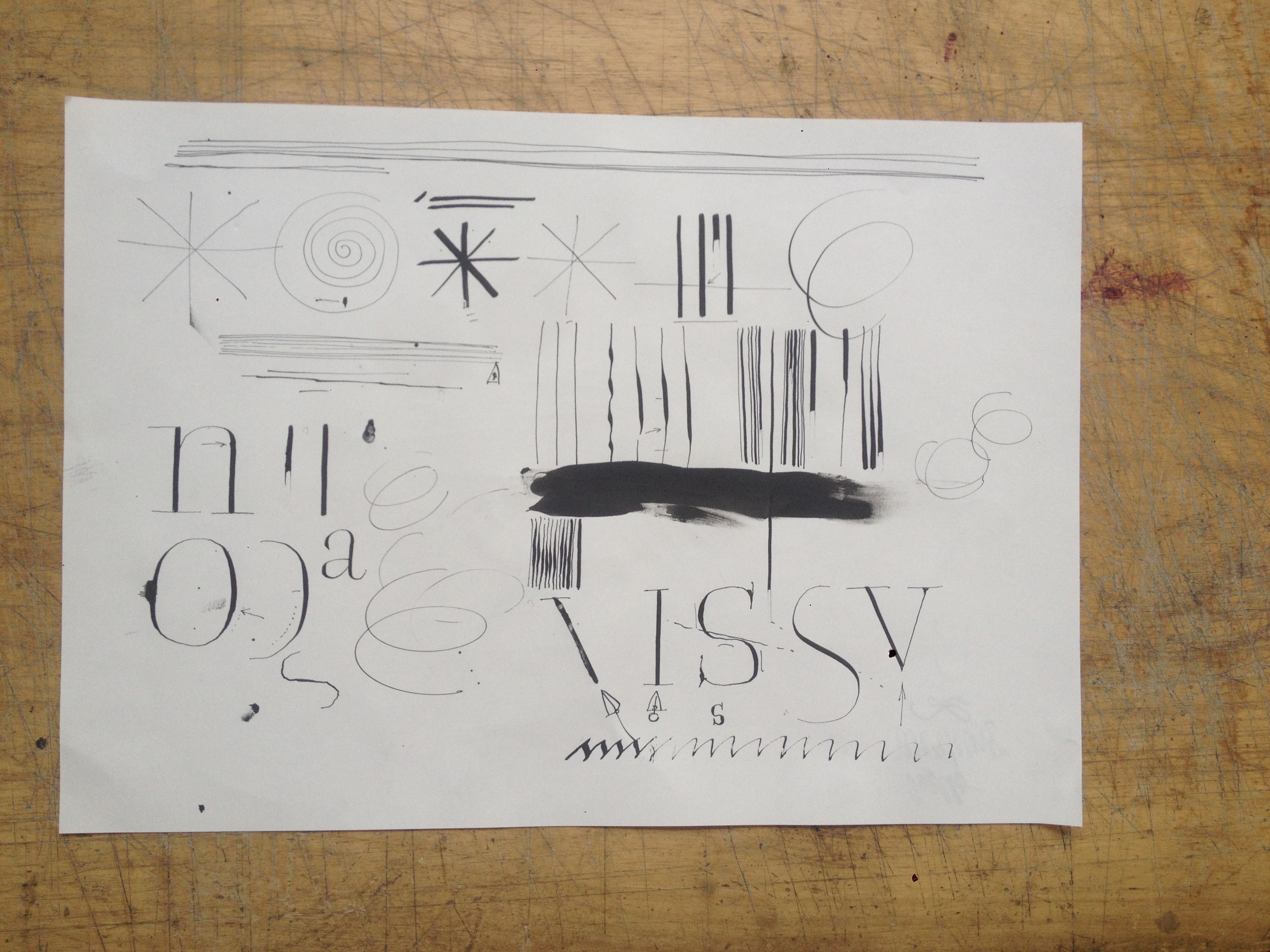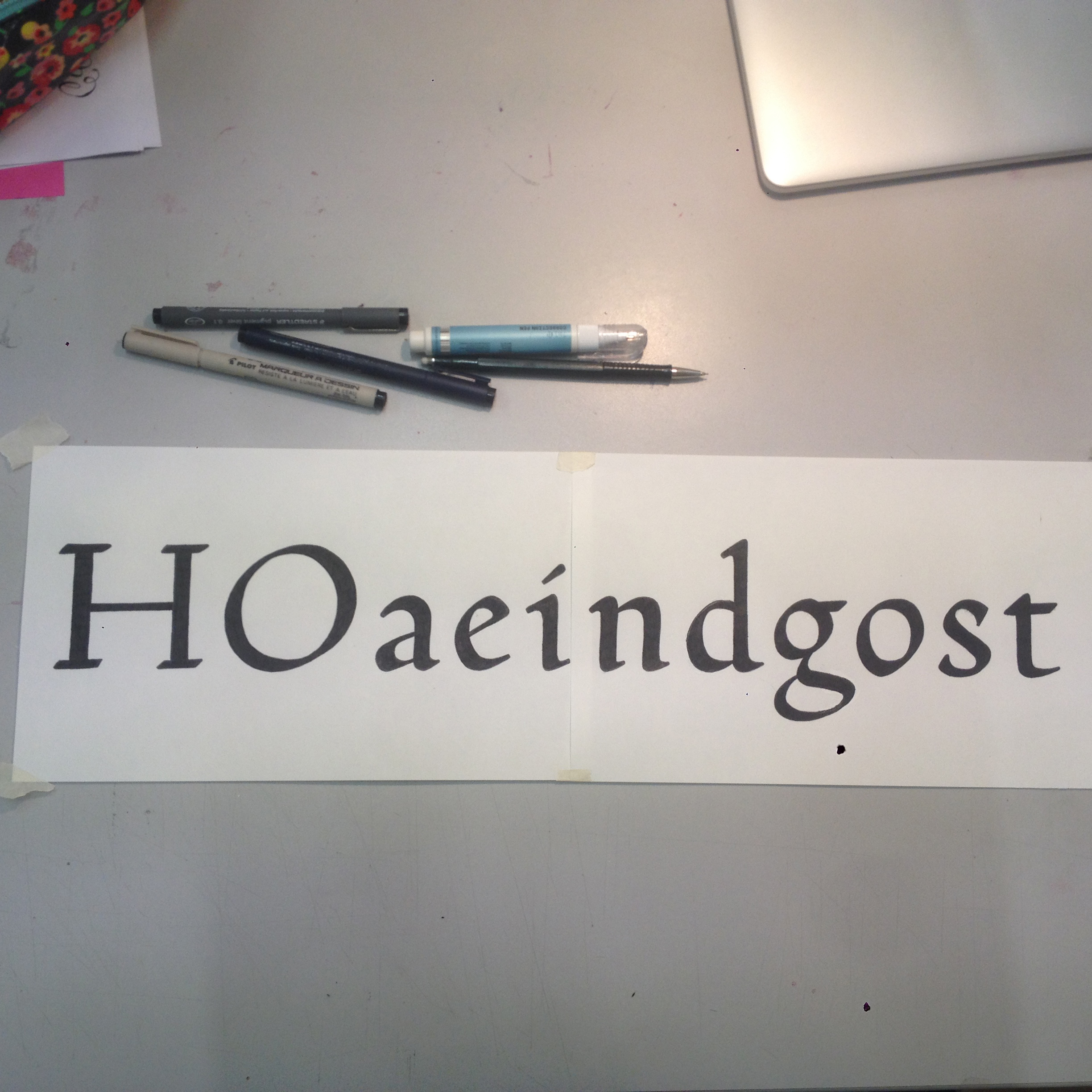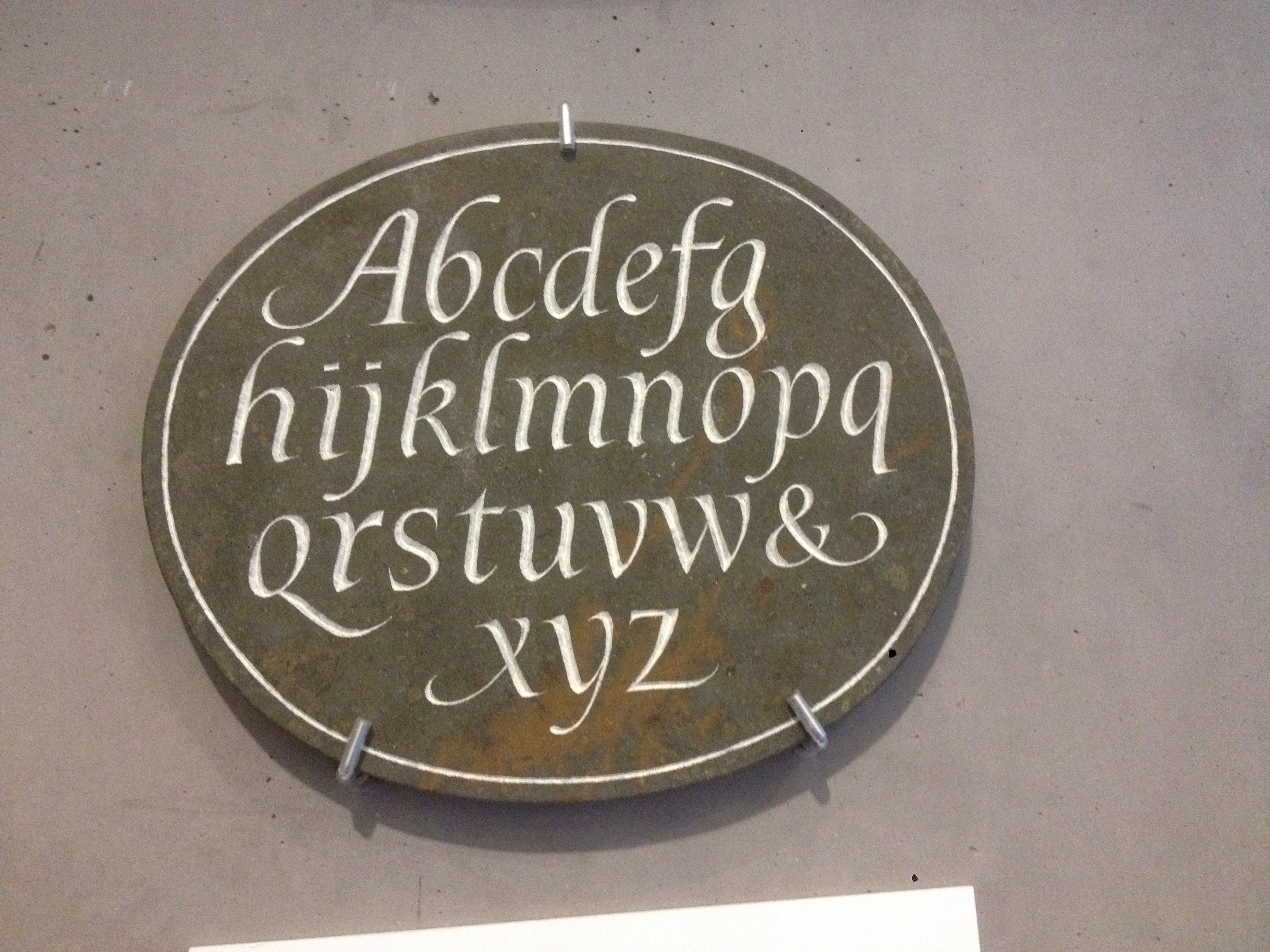 Days go, and you begin to realise that it’s all about the process. So many things start to happen that you have no time for anything. You spend more and more time at school. Come early in the morning and leave late in the evening. IMG_7539 You have lessons. IMG_7490 IMG_6980 Then you go to the shop, buy all the stuff for writing and start to practice. IMG_6959 First of all, writing with a brush. You write at school. You write at home. Everywhere 🙂 IMG_7289 IMG_6956 IMG_6963 IMG_6945 IMG_6946 You also write with a pointed nib. First week just all types of lines. Then you can start to write words. IMG_7010 IMG_7012 IMG_7016 Another important thing, apart from practise, is watching. You should look around as much as you can. Look for interesting books and letters. The more you see, the better. First of all, you have lectures where you see lots of everything. Supernice, but if we are told about something, we can see it live. It’s a totally different impression, when you look at the book in reality, not on the screen. Thanks to Jan Willem Stas for that. IMG_7390 IMG_7051 IMG_7054 IMG_7029 IMG_7025 IMG_7045 IMG_7046 IMG_7047 IMG_7067 IMG_7096 IMG_7098 IMG_7071 IMG_7070 IMG_7075 IMG_7084 IMG_7411 IMG_7091 IMG_7092 IMG_7106 IMG_7125 We have excursions too. Amsterdam Special Collections last week, Gemeentemuseum next week. IMG_7253 IMG_7186 IMG_7189 IMG_7194 IMG_7198 IMG_7210 IMG_7212 IMG_7213 IMG_7458 IMG_7232 IMG_7238 IMG_7259 IMG_7269 School library. They have an amazing second floor there. And many-many books about everything. IMG_7378 IMG_7353 IMG_7359 IMG_7360 IMG_7363 When you look at things you always see something interesting for your work there. For example, I found a book on the flee market. A Baedeker guide around Paris, 1907. It has really amazing engraved maps. So I tried some of the letter shapes from there for my writing with a pointed nib. IMG_7428 IMG_7423 IMG_7424 IMG_7339IMG_7391 IMG_7392 Now we gradually move from writing to drawing. But writing is a basis. Our first assignment looks like this. We take a brush, and write HO aeon (b, d, p, q) gost. Then, we use this writing as a skeleton for our drawing of these letters. Normal contrast. So you write first, then draw the pencil outlines on marker paper (it is transparent), then revise spacing and draw again with a black marker.
