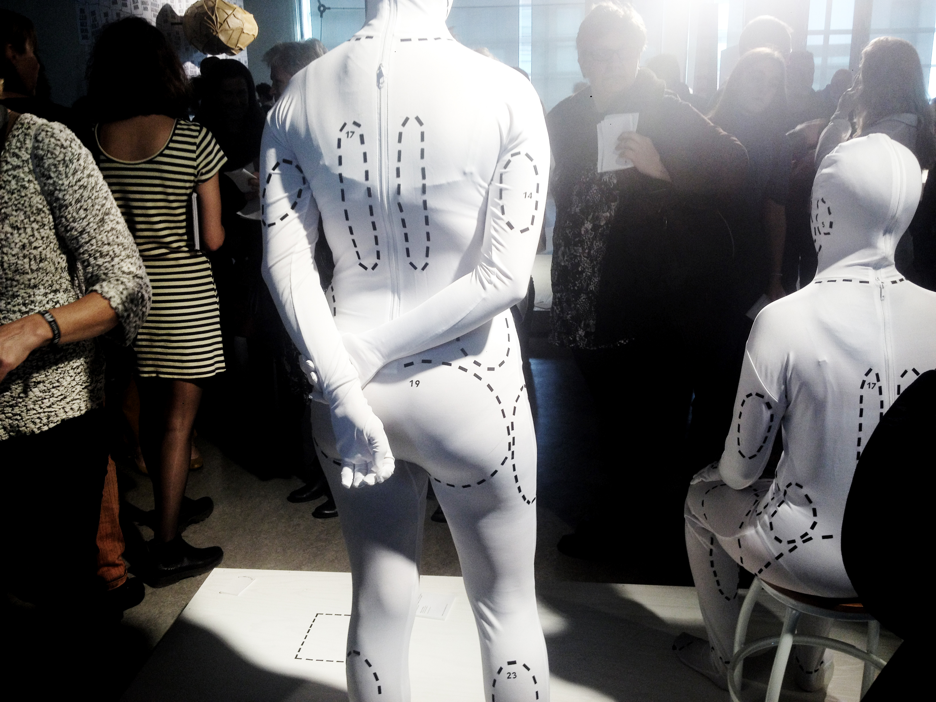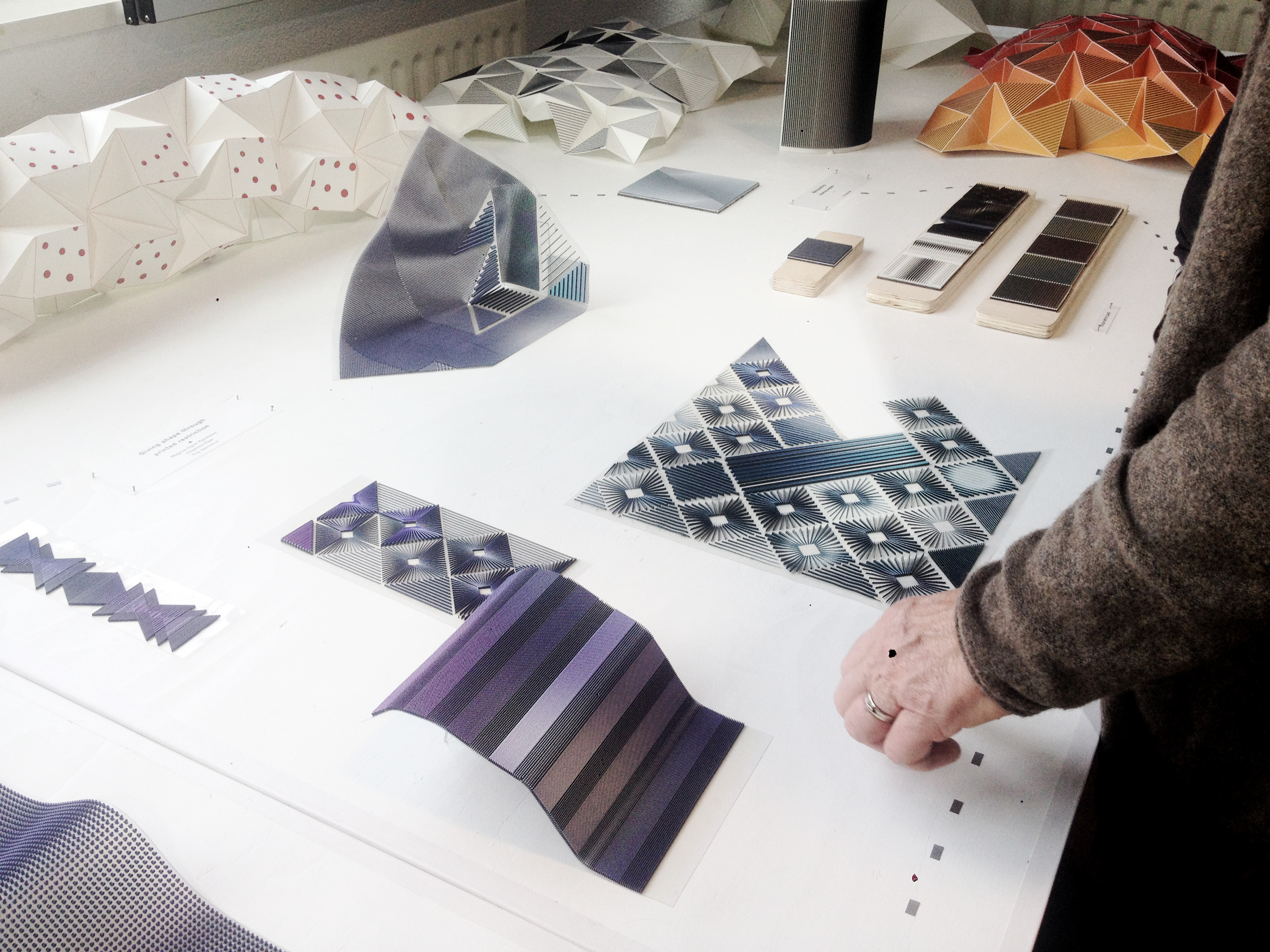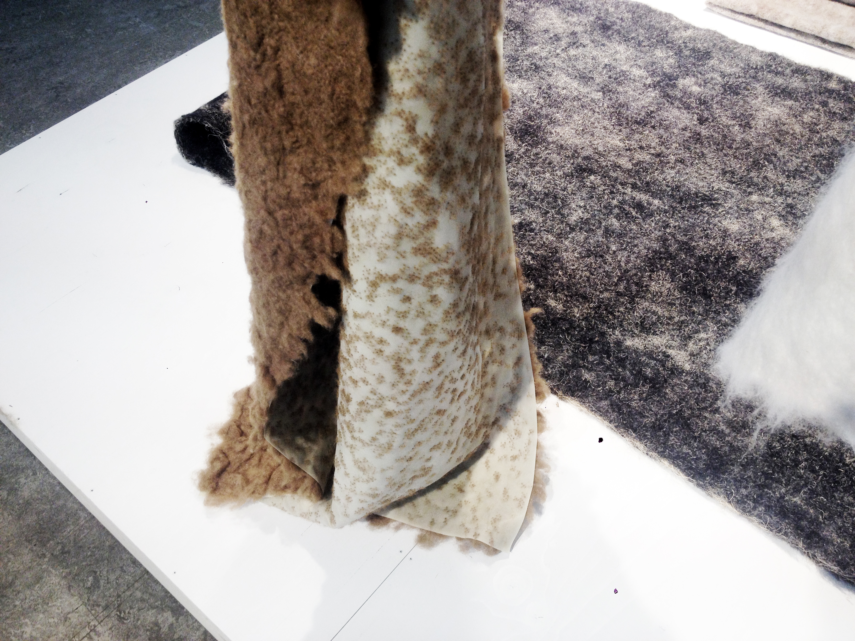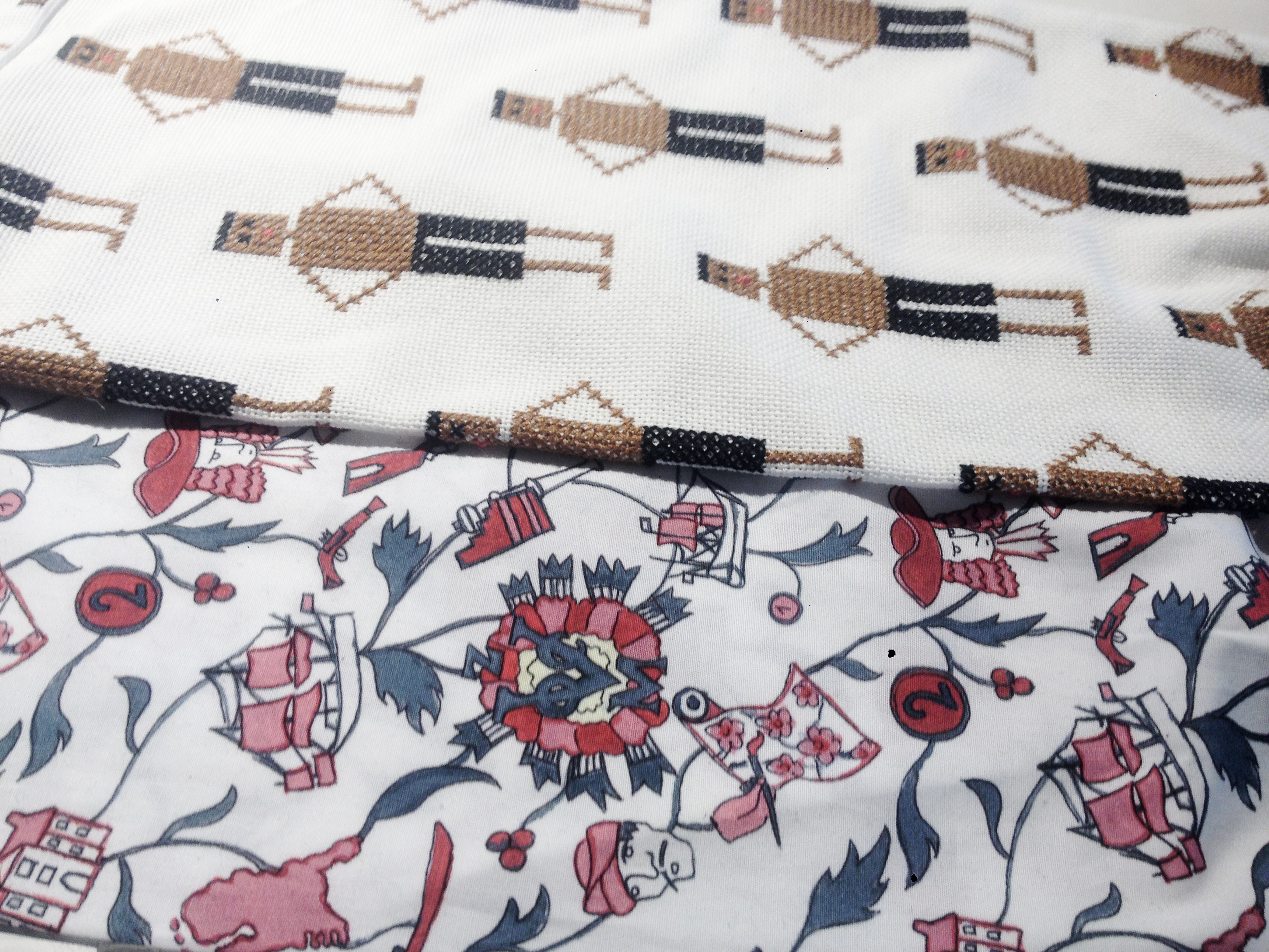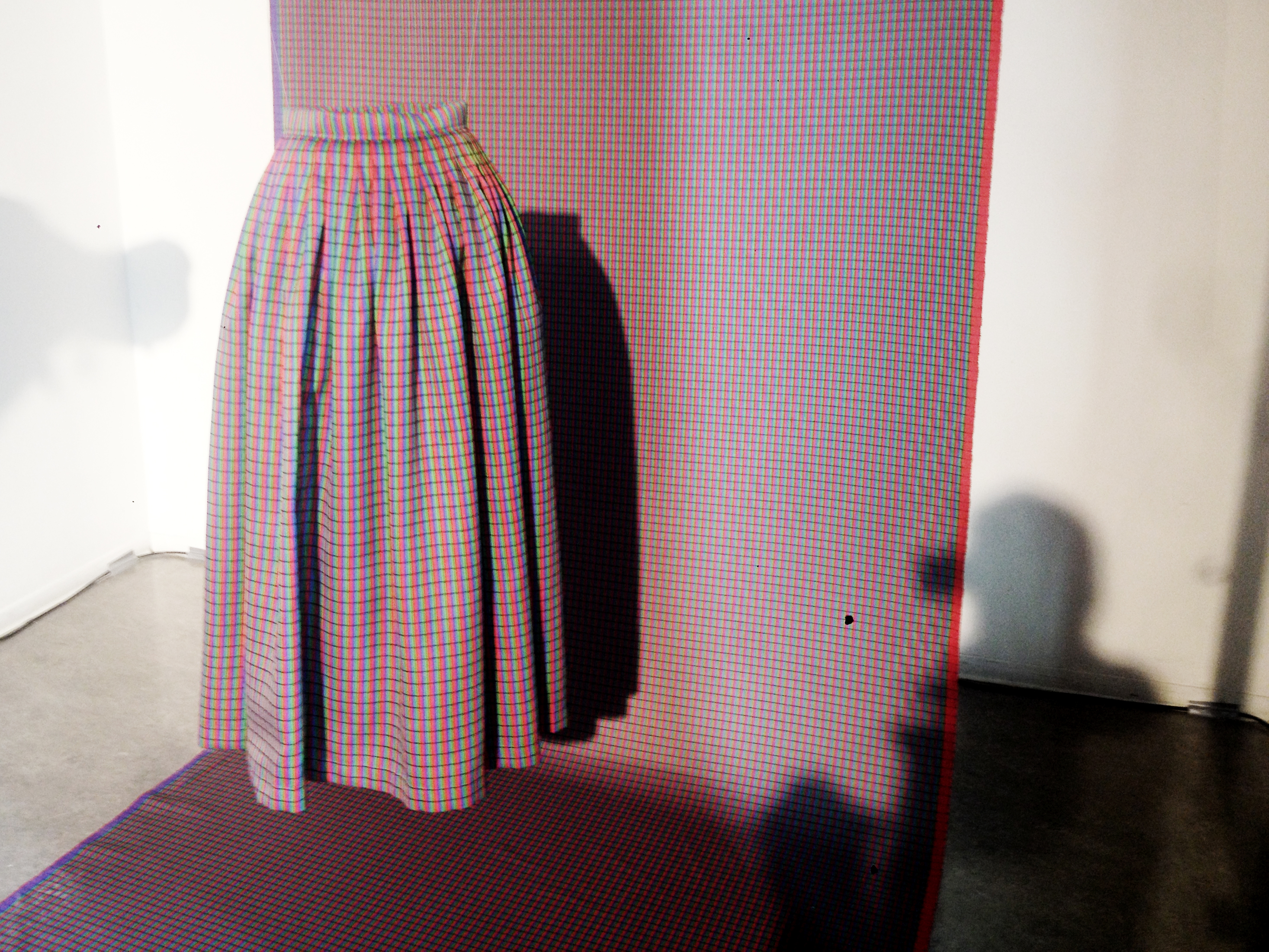 Textiles, imitating human skin and hair. RGB pixel pattern, enlarged and printed. Same effect — grey from the distance, three colours, when you come closer. Embriodery. People talking when doing embroidery, a social project, bring different generations together, while learning craft. Just the way it was earlier.